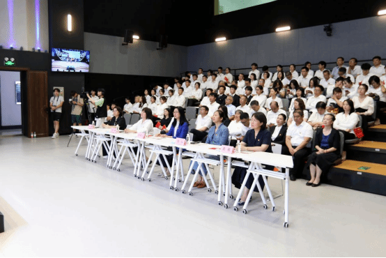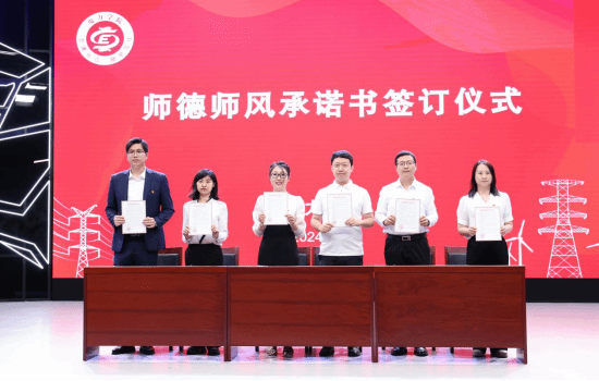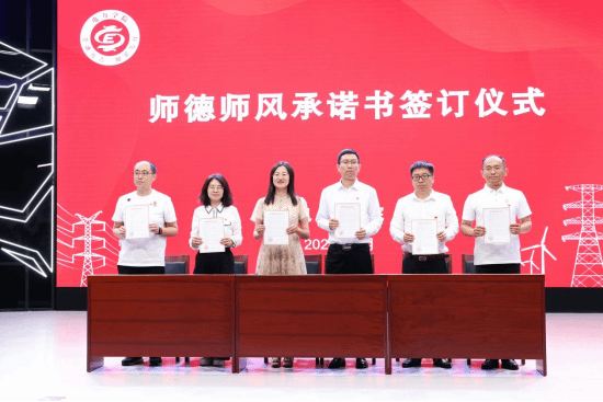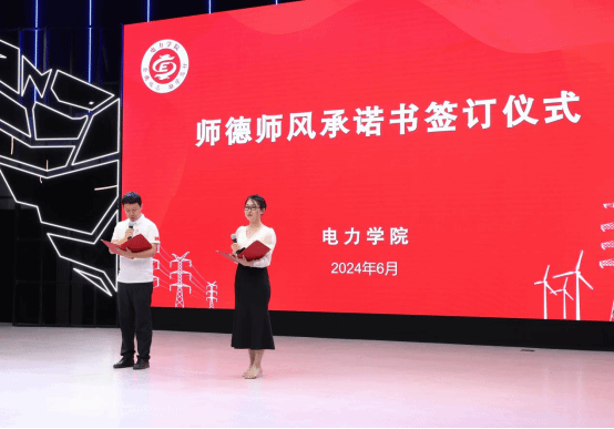 活动第二项议程——《师德师风承诺书》签订仪式,青年教师钱小毅、姜兴宇代表全体教师上台宣读《承诺书》,他们郑重承诺将严格遵守师德师风,以高尚的品格和渊博的学识,为员工们树立良好榜样。随后各系部中心主任及教师代表上台签订《师德师风承诺书》。