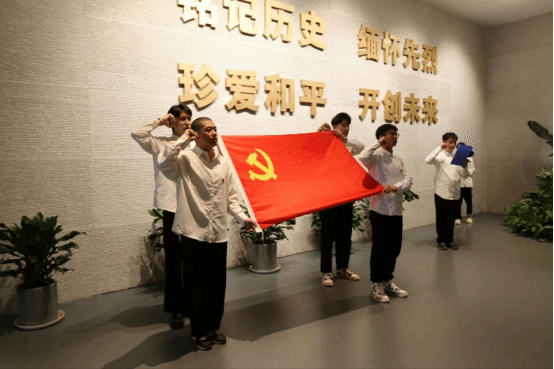 在英雄先烈纪念厅中,全体师生党员伫立在党旗前,重温入党誓词,大家高举右臂,庄严宣誓,铿锵有力的宣誓声响彻大厅,表达了为党和国家事业奋斗终生的决心。