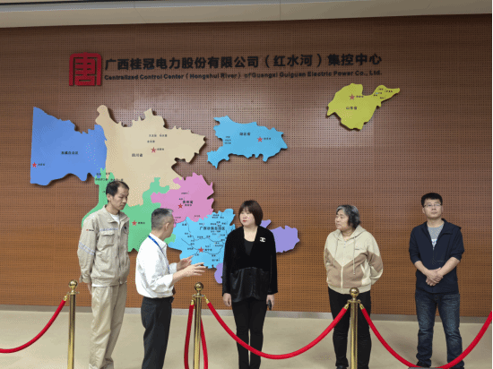 在南宁,员工代表陪同王隽书记一行参观了桂冠电力(红水河)集控中心的调度大厅,工作人员详细介绍了集控中心所管辖的范围及职能。集控中心通过先进的技术手段,实现了对下属发电场站的远程监控与管理,大大提升了运营效率和安全性。少人值守模式不仅减少了人力成本,也降低了人为操作可能带来的风险。同时,集控中心的数字化、智能化和智慧化运行,能够实时分析大量数据,进行精准的调度决策,确保电力系统的稳定运行,为广西地区经济发展提供强有力的能源保障。