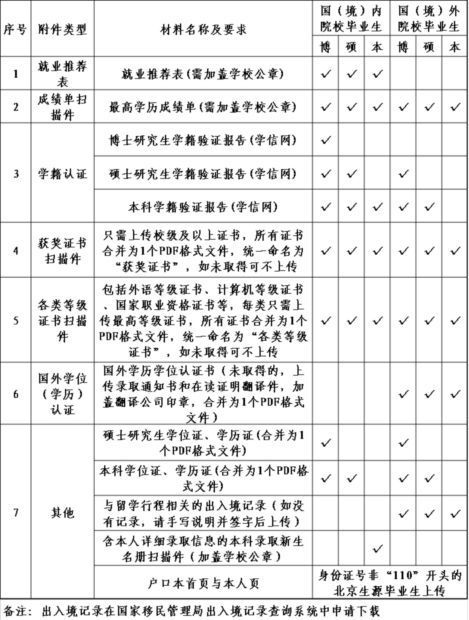(1)国(境)内院校毕业生:须上传《教育部学籍在线验证报告》(学信网)、加盖公司公章的就业推荐表和成绩单等;本科生还需上传含本人详细录取信息的本科录取新生名册扫描件(加盖公司公章);研究生还需上传本人本科主修专业的毕业证和学位证扫描件。